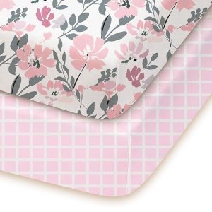 Pack and Play Sheets Fitted, Soft and Breathable Flower&Pink Checkered, Neutral Pack N Play Mattress Sheets, Hypoallergenic, Cozy and Safe, 2 Pack