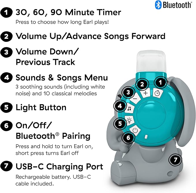 - Use day to night as they grow: soother and night light support the infant stage for deeper, uninterrupted sleep to promote brain development; cute music player and color-changing light show keeps baby engaged anywhere Earl goes