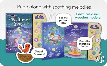 Toddlers and preschoolers can sing along with the classic bedtime melodies in this charming songbook. Featuring a wooden inlay and sturdy construction, giving it a vintage feel, this book is sure to delight while teaching an appreciation for both music and together time. Perfect for little ones (and their grown-ups) to sing along as part of a nightly bedtime routine. Bedtime Songs is sure to be a family favorite.