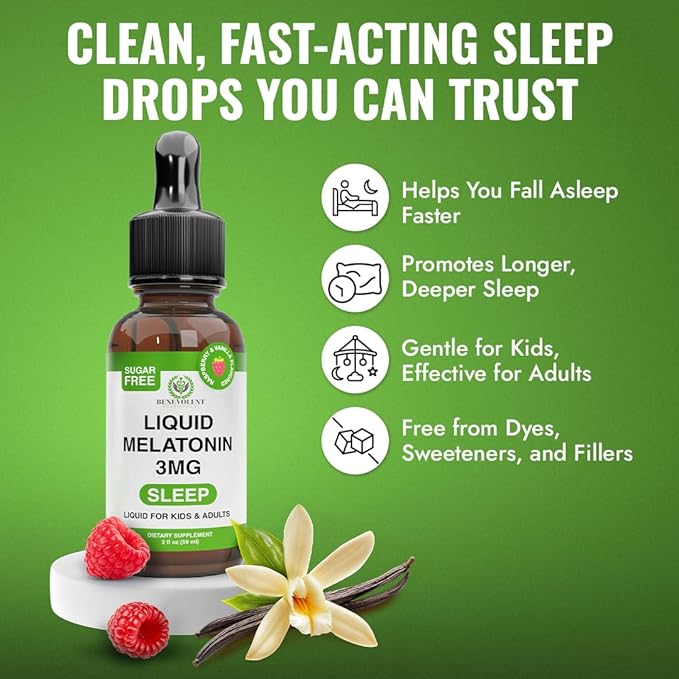 Benevolent Liquid Melatonin Drops for Adults and Kids 3mg – Melatonin Liquid as Fast-Acting Sleep Aid to Fall Asleep Faster & Longer – Non-GMO & Made in USA – Berry Vanilla Flavor, 2 Month Supply