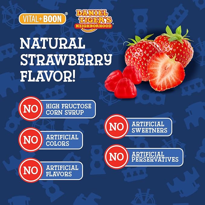 - PREMIUM SUPPLEMENTS FOR KIDS – Daniel Tiger’s Neighborhood, the renowned children’s show from Mister Rogers Productions on PBS kids is teaming up with Vital Boon to create premium gummy supplements for kids. Help add tasty, kid-friendly dietary supplements to their daily routine.