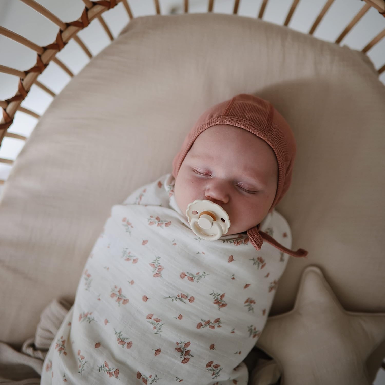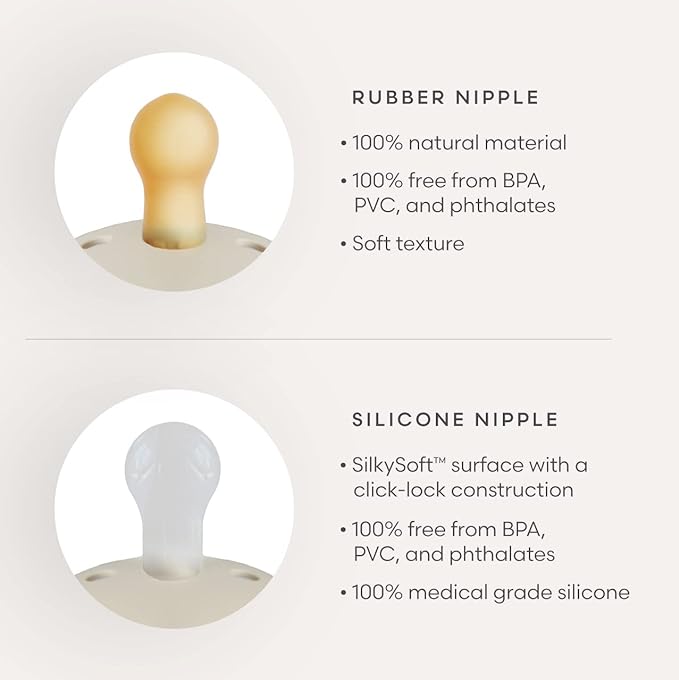 - 100% free from BPA, BPS, PVC and phthalates. Pacifiers are made with natural rubber and may expand with use.