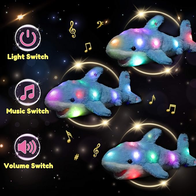 • EXTRA ADJUSTABLE VOLUME: There are three buttons on our plush shark. On the right fin of the shark, the switch controls the light on or off. Press the ‘♬’ button on the other side of the lovely shark plush, shark will play the music, press again, it will stop, again, it will change to another song. The button embroidered with speakers is the switch to control the volume, includes 3 levels, you can adjust it as you like.