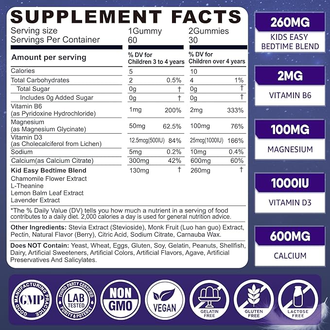 - Relaxation, Calm & Growth: Includes calming herbs such as Chamomile, Lemon Balm, and Lavender, along with Magnesium Glycinate and L-theanine, to promote relaxation, unwind and support restful sleep for kid. Combine with calcium & d3, these sleep gummies also help support healthy bone and overall kids’ natural development.