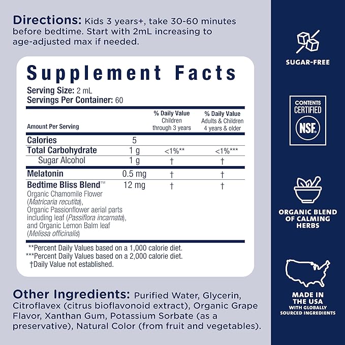 - Kid-Approved Taste: We’ve created our kids’ liquid melatonin with a delicious grape flavor that’s also sugar free. Recommended for children 3 years and up
