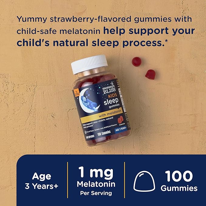 Mommy’s Bliss Kids Sleep Melatonin Gummies, No Artificial Colors, Flavors or Gelatin, Strawberry Flavor, Age 3+, 100 Gummies (Packaging May Vary)