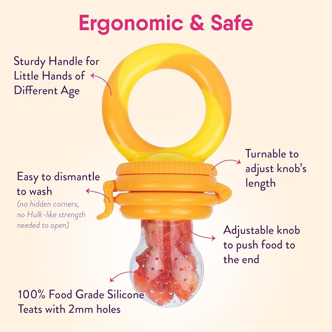 - ★ MOST VALUE FOR MONEY BABY FRUIT / FOOD FEEDERS & TEETHERS (2 PCs w 4 Silicone Teats) – Nature Bond Baby Fruit Feeders and Teethers are designed in “APPETIZING” candy-like colors that stimulate baby’s appetite for consumption of natural nutrients from fruits and vegetables. It is also a safe way to introduce our little ones to solid food while they go through weaning and teething phase. The All-IN-1 feeder can also soothe baby’s teething discomfort by massaging the gums through chewing.