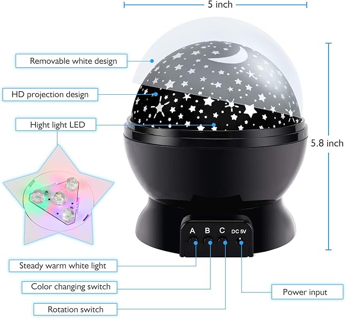 - Starry Sky Night Light Projector: This is a new popular star projector lamp. Create a universe in your home and light up your room with stars and moons. You will feel like you are sleeping under the stars. Create a color-changing ceiling that takes up less space. Encourage talent and creativity by enjoying colorful star lights with your kids
