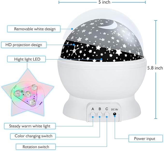 - Starry Sky Night Light Projector: This is a new popular star projector lamp. Create a universe in your home and light up your room with stars and moons. You will feel like you are sleeping under the stars. Create a color-changing ceiling that takes up less space. Encourage talent and creativity by enjoying colorful star lights with your kids