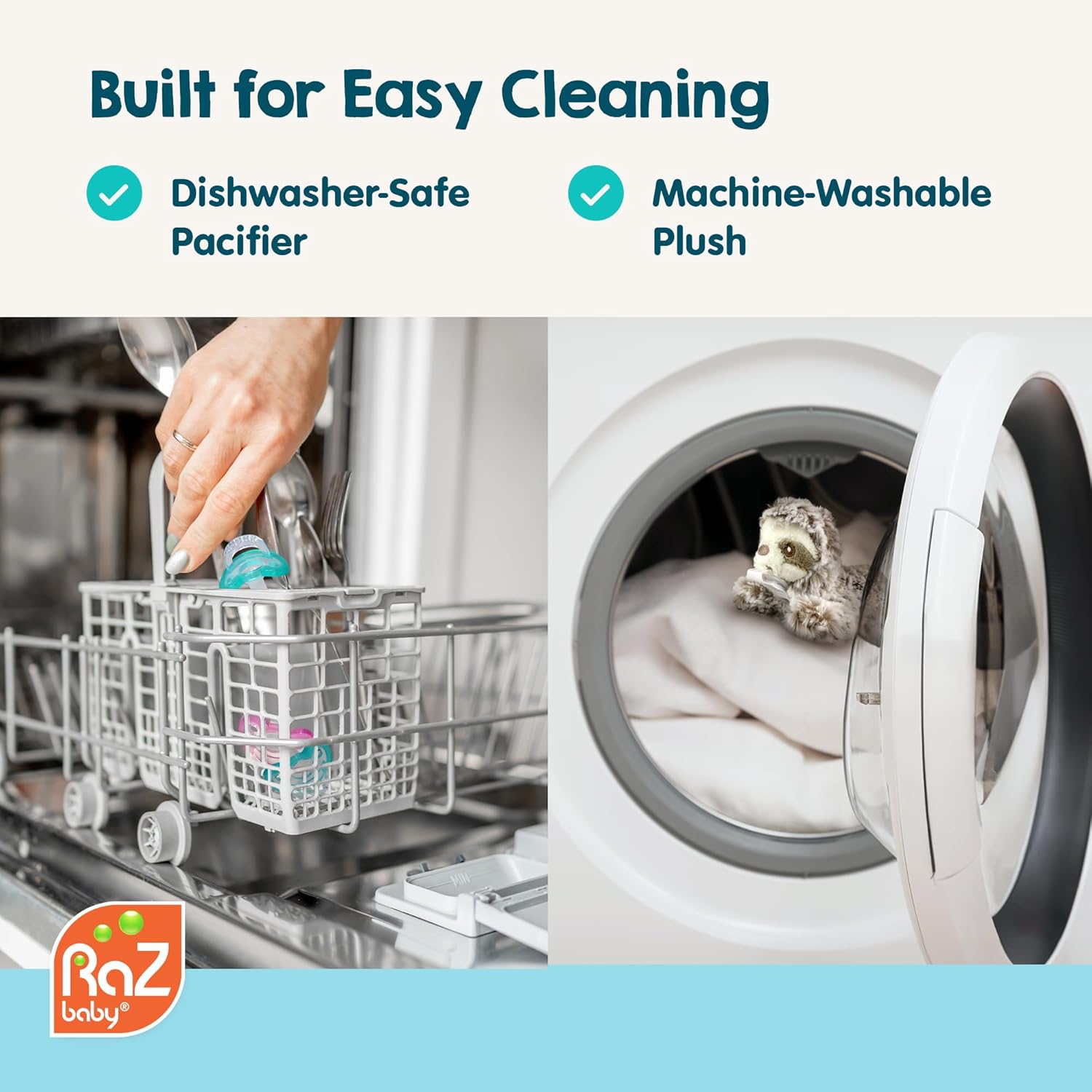- Easy to Clean & Sterilize: The Raz buddy plush is machine washable for effortless maintenance, while the detachable Jolly Pop pacifier should be sterilized first, then dishwasher-safe for easy cleaning and convenient attachment swaps.
