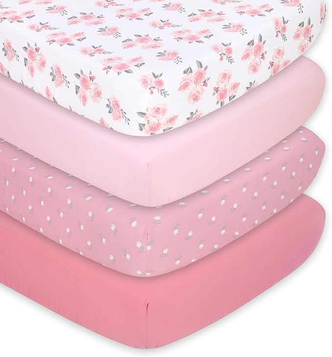 - Floral Sheets: This lovely artwork of a pink and violet bouquet 4 pack crib sheet set in crisp white background complimented by the smaller floral coordinate print is the optimal start for your baby girl.