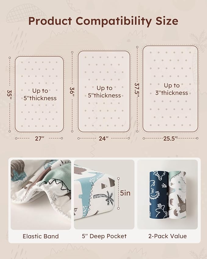 - Snug Fit and Secure: Measuring 38″x26″, Yoofoss mini crib sheets are designed to snugly fit most Pack n Play or potable player mattress. The 3–5-inch-deep pocket provides full coverage that wraps around the mattress to keep the sheet neatly in place, ensuring a safe and comfortable sleep for your baby.