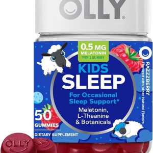 OLLY Kids Sleep Gummy, 0.5mg Melatonin, L Theanine, Chamomile, and Lemon Balm, Childrens Chewable Supplement, Raspberry – 50 Count