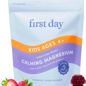 FIRST DAY Magnesium for Kids Gummies – Calm Kids Magnesium Citrate Gummies to Support Sleep & Relaxation – Bedtime Supplement with Suntheanine® L-Theanine, NO Melatonin – Strawberry – 30-Day Supply